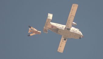 Loadmaster releases glider and glider rolls out of the cargo compartment. A static line extends wings and the glider stabilizes in a glide. Alternately glider is released from a helicopter sling load.